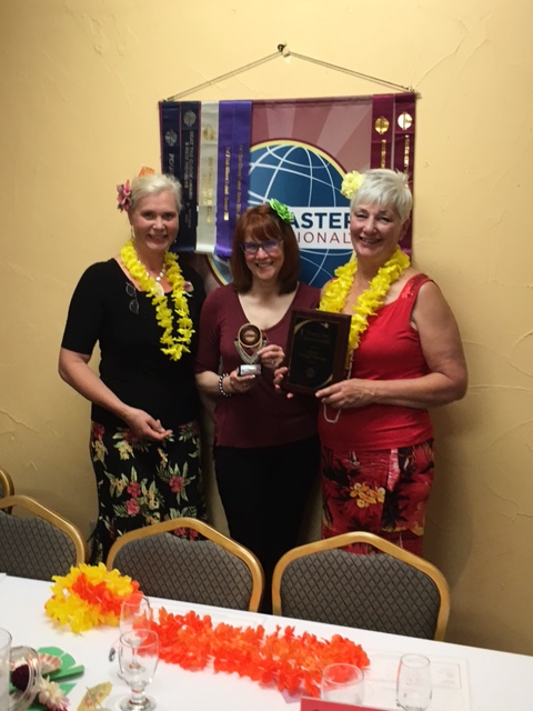 Bev for Best Evaluator, Monica for Best Table Topics Speaker in our Hawaii themed meeting! (August 2017)