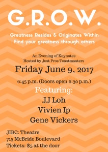 Finding Vino Toastmasters is proud to say that one of our own, Vivien Ip, was a keynote speaker at Just Pros Toastmasters GROW Event, proving without a doubt that Greatness Resides and Originates Within! Congrats, Vivien!